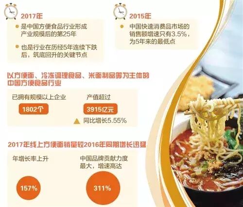 阿里巴巴大数据发布的《2017线上方便面相关消费系列研究》显示,2017年线上方便面销量较2016年同期增长迅猛,年增长率上升157%,中国品牌贡献力度最大,增速高达311%。